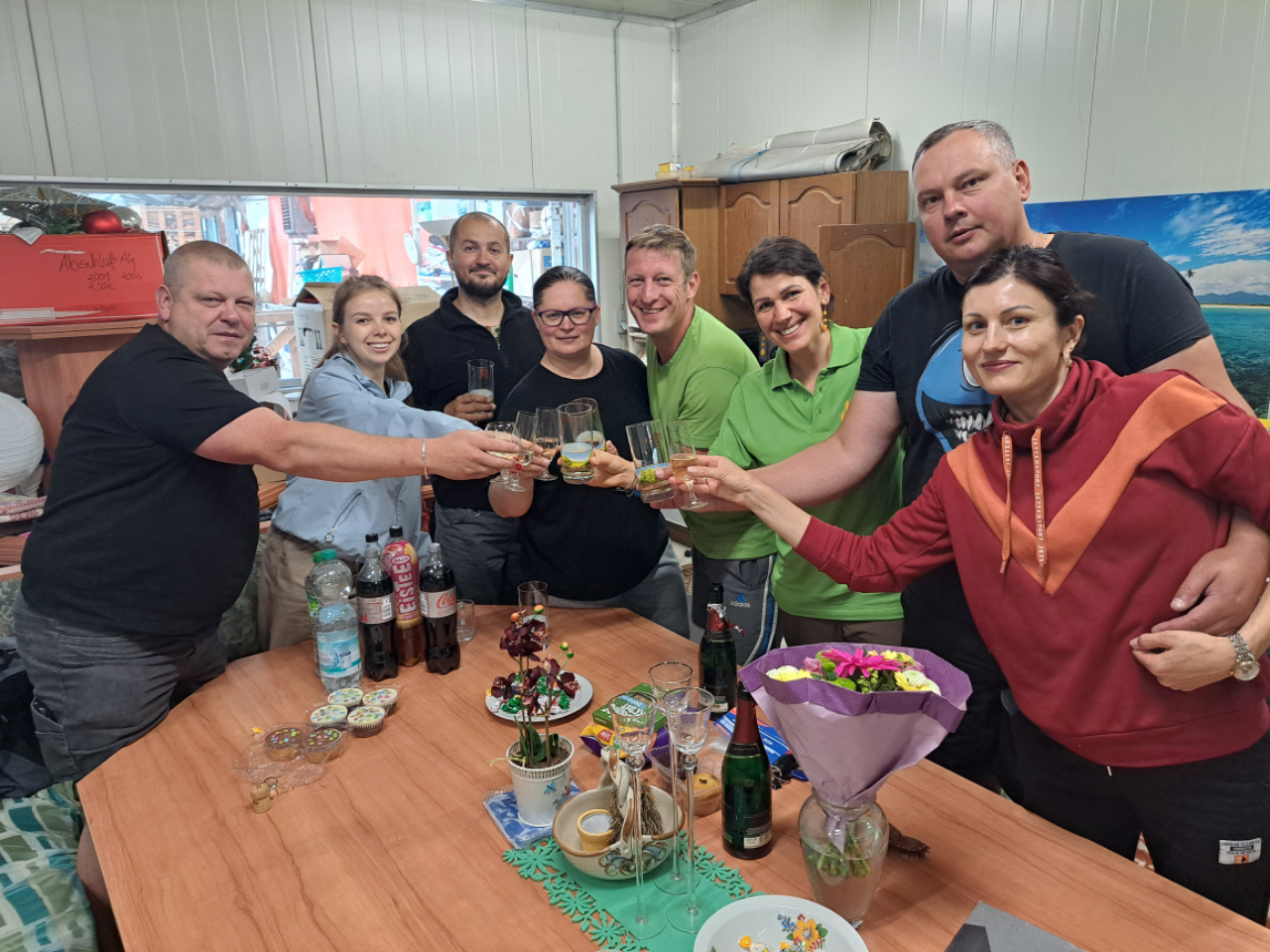 Erst durften wir noch mit unserem Geburtstagskind - unserer Helferin Oksana - auf ihr Wohl anstoßen. Und dann wurde der Lkw innerhalb von nur 3 Stunden beladen.
