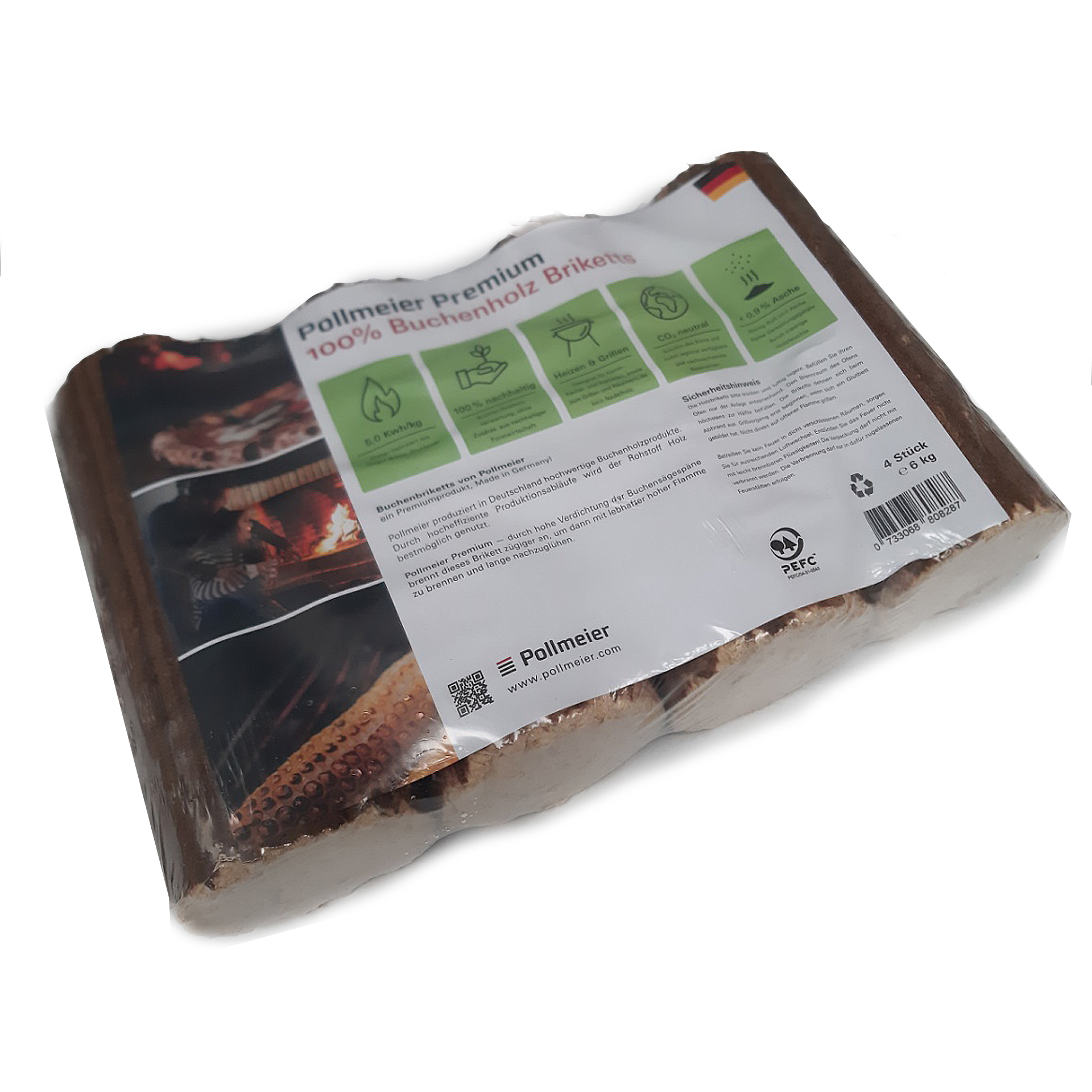 Unsere runden Pollmeier-Buchen-Briketts werden in Deutschland hergestellt und sind zu jeweils 6kg in Thermofolie verpackt. Sie warten mit einigen Besonderheiten auf. Runde Holzbriketts dehnen sich beim Verbrennen in der Länge aus. Dies sollte unbedingt bei der Befüllung des Brennraumes entsprechend der Brennraumgröße beachtet werden. Allerdings sind die runden Holzbriketts gut auch ohne Säge oder Axt teilbar, sodass ihre Länge angepasst werden kann. Eine weitere Besonderheit der runden Buchen-Briketts ist die enorm hohe Strahlungswärme. Wir empfehlen diese Briketts dafür insbesondere für Feuerstätten mit Sichtfenster. Für das Anbrennen dieser Holzbriketts reicht in der Regel einer unserer Kiefernholzwolleanzünder, ggf. noch unter Zugabe von Anmachholz. Für das Anbrennen kann man auch kleinere Scheiben des Briketts abbrechen und diese in Verbindung mit der Kiefernholzwolle als Anzündhilfe verwenden. Diese Holzbriketts bilden ein sehr schönes Glutbild. Achtung! Ab 4 Paletten erfolgt die Anlieferung ggf. in 2 Teillieferungen!